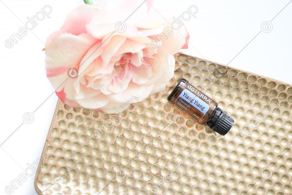 A high resolution image of a 15 ml bottle of Ylang Ylang essential oil on a gold tray with pink flowers. It comes on a white background for a minimalist feel.