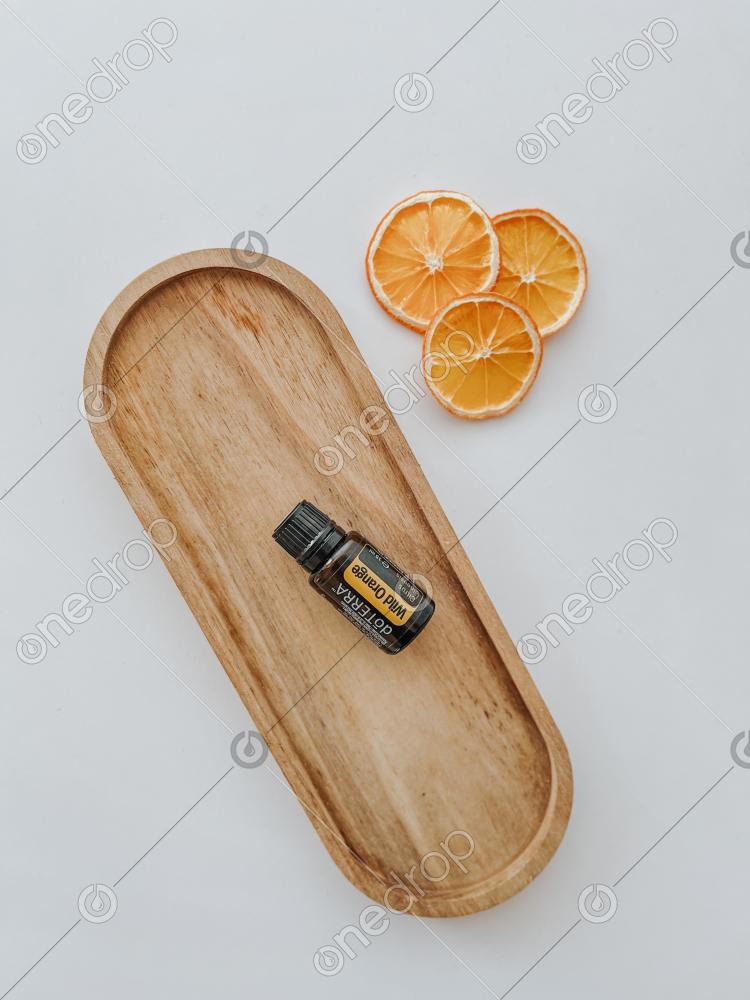 15 ml Wild Orange bottle on a wooden tray and dried oranges on a white table.