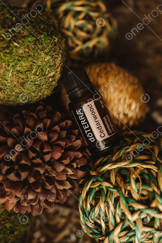 High-res photo of a single 15mL bottle of Cedarwood oil, on a rustic boho background of natural colors and textures