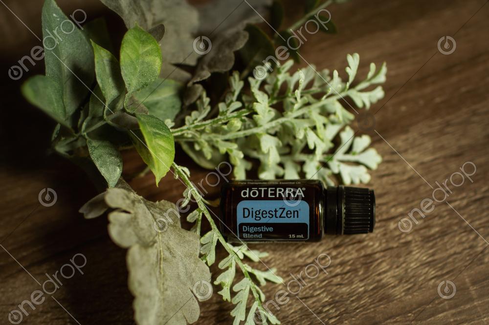 High-res photo features the 15mL bottle of dōTERRA DigestZen® oil , shown on a wood background with green plants
