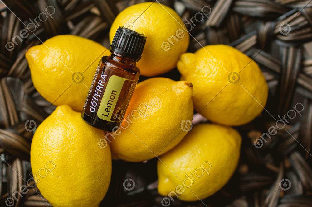 High-res photo of a single 15mL bottle of lemon oil in a basket of lemons.