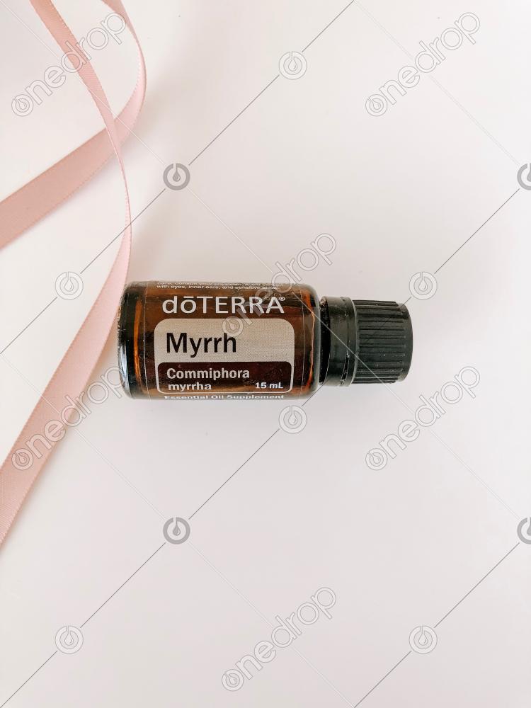 A high-res image of a full sized bottle of Myrrh essential oil on a simple background with subtle soft blush pink ribbon sweeping across.