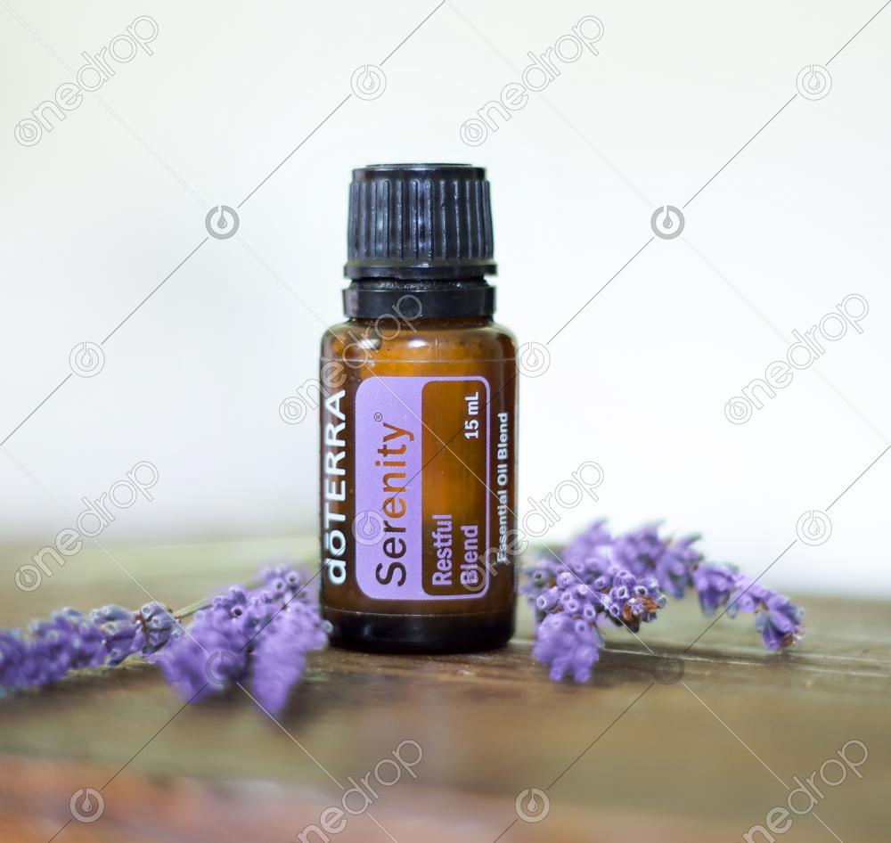 This high resolution photo features doTERRA Serenity® on wood with neutral background. Surrounded by purple flowers.