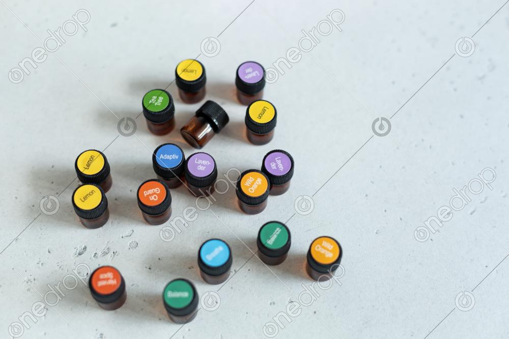 2 -images bundle - A lot of sample bottles 1 ml with essential oils for sharing, top view