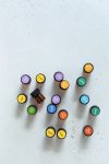 Sample bottles 1 ml with top essential oils for sharing with people on white background, top view