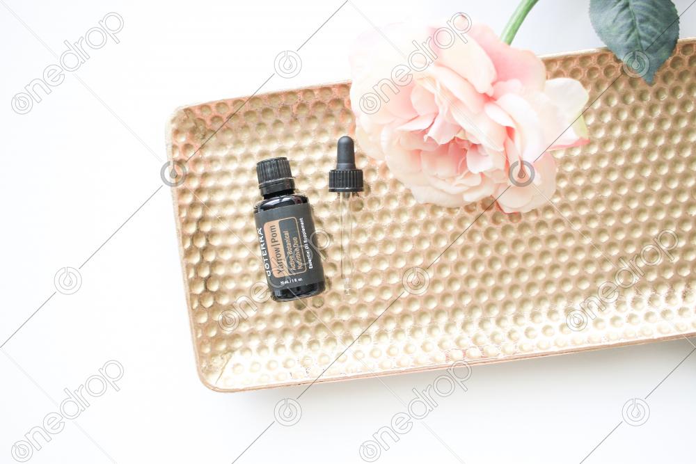 A high resolution image of a 30 ml bottle of Yarrow Pom essential oil on a gold tray with pink flowers. It comes on a white background for a minimalist feel.