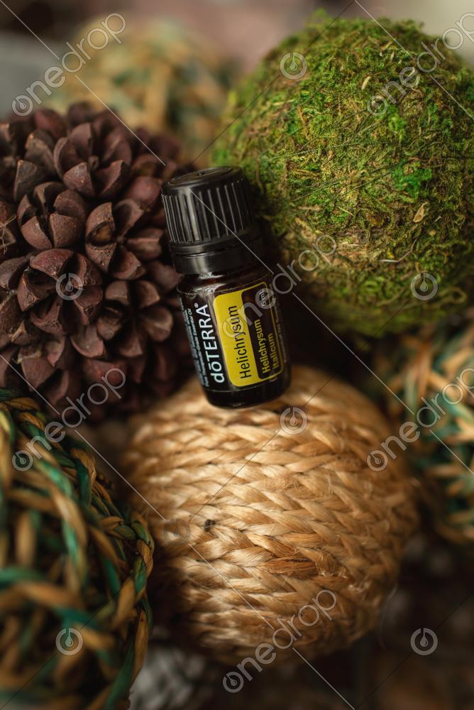 High-res photo features the 5mL bottle of Helichrysum oil , shown on textured natural background
