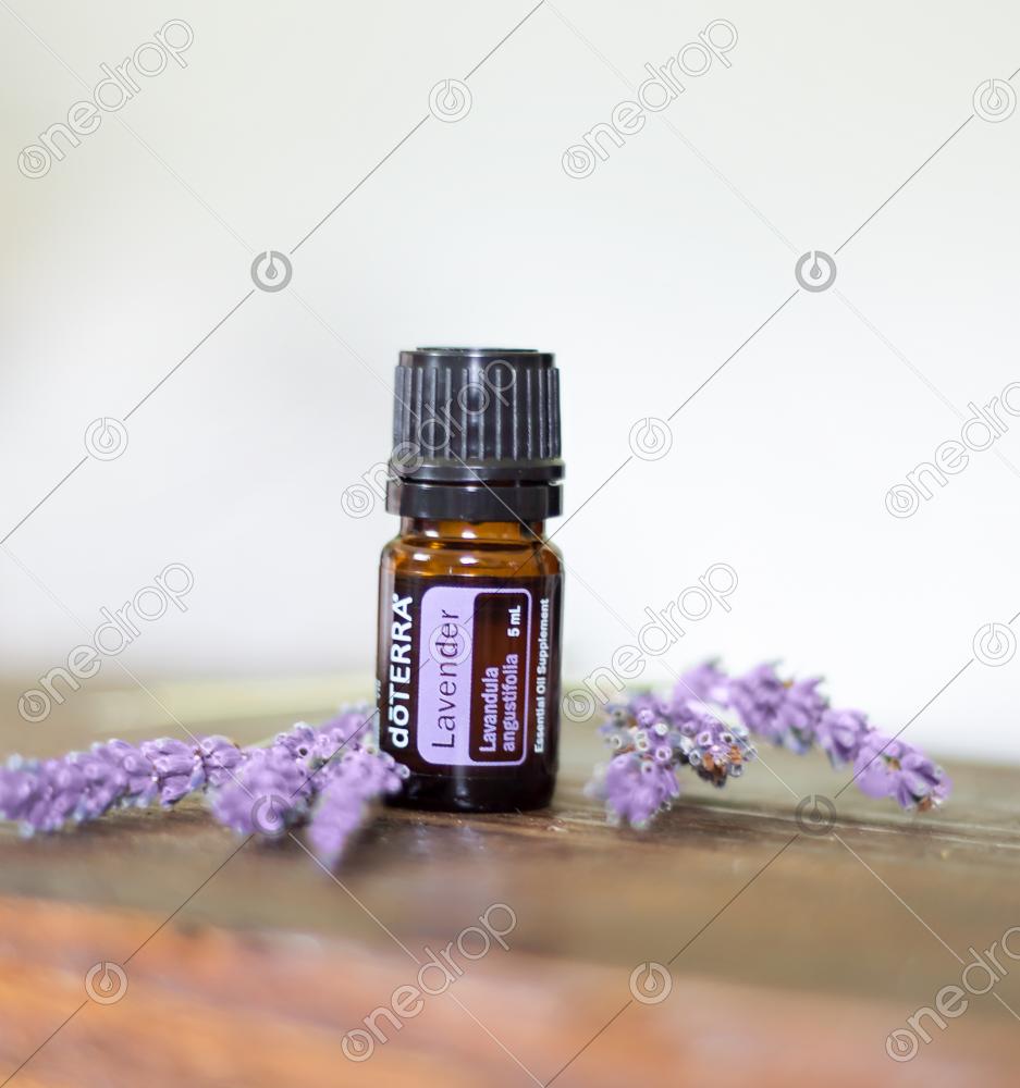 5ml dōTERRA Lavender bottle on wood with purple flowers