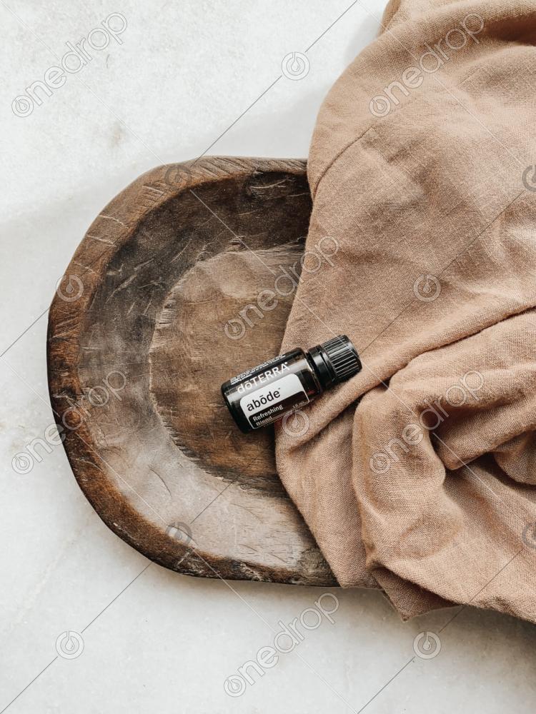 Flatlay image of abode essential oil blend on linen and a wooden tray. Crop or edit picture to suit your needs or leave as is.