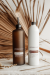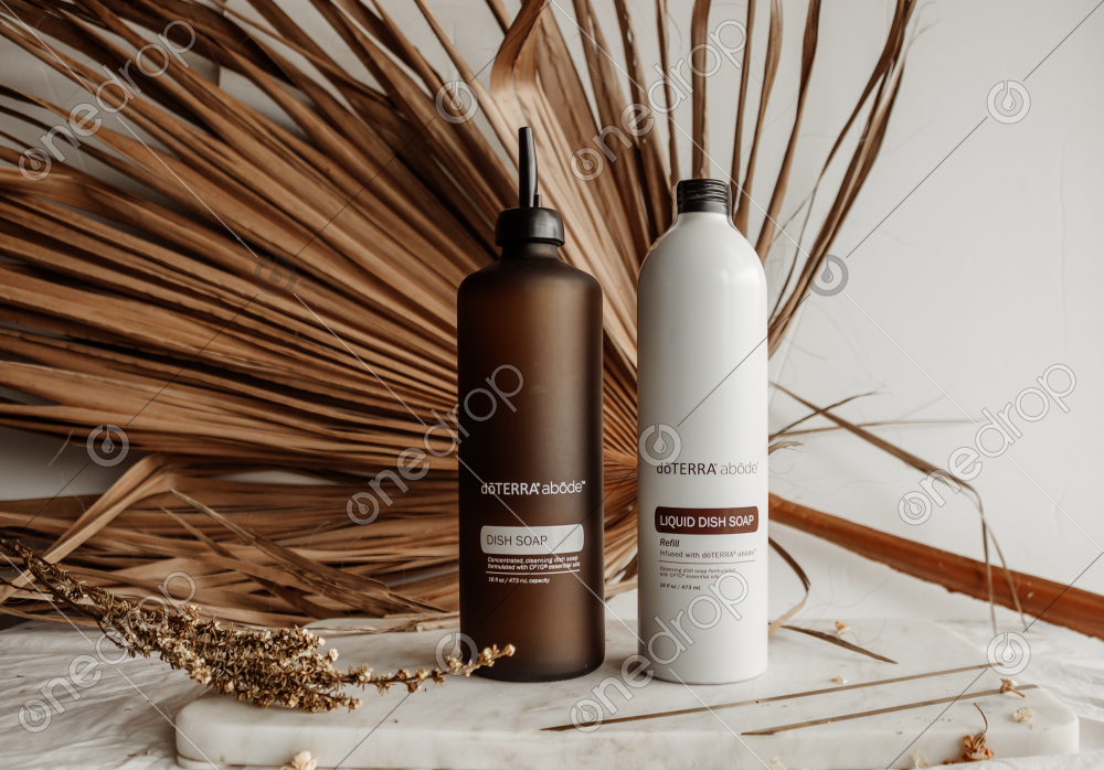 High Res image of Abōde™ Dish Soap Dispenser and Refill standing on a marble board with dried palm leaf in background.