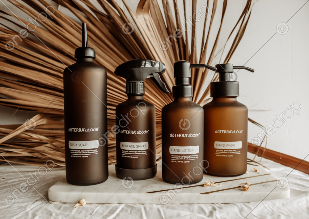High Res image of Abode Dispenser Set standing on a marble board with dried palm leaf in background.
