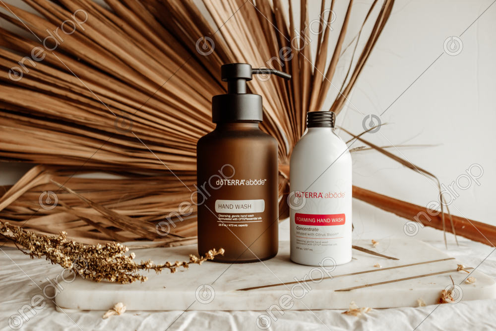 High Res image of Abode Foaming Hand Wash Dispenser and Refill standing on a marble board with dried palm leaf in background.