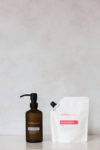 Product photo of Abōde Hand Lotion Dispenser and Refill. Neutral color and minimalistic styling. Negative space for text overlay. Horizontal and vertical image included.