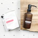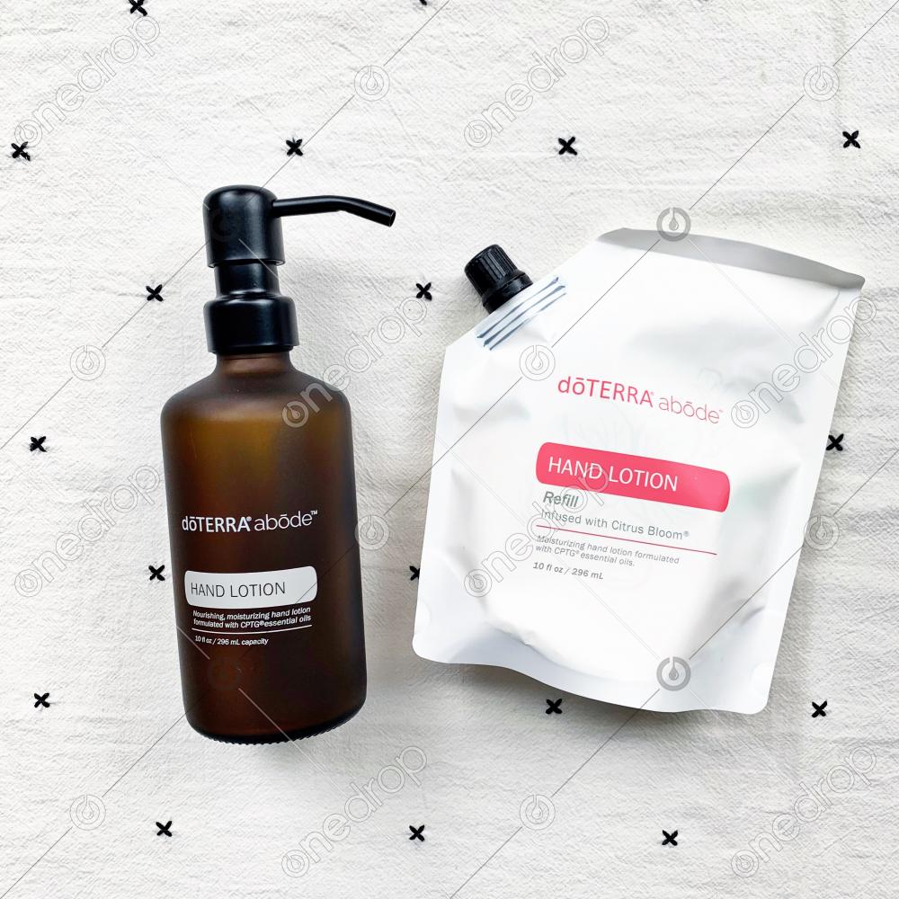 Features the abōde Hand Lotion Refill infused with Citrus Bloom & Amber Glass Bottle in a Flat Lay.