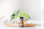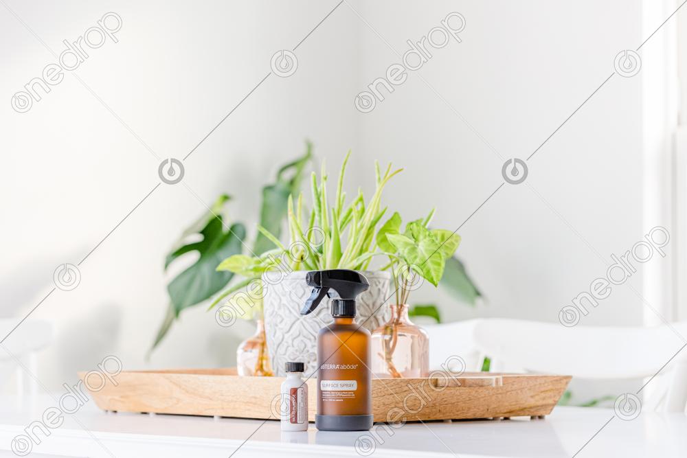 abōde multi-surface spray dispenser and cleaner concentrate with white background and plants. Blank space can be used to add text or high resolution image can be cropped creatively for Instagram, Facebook, or social media.