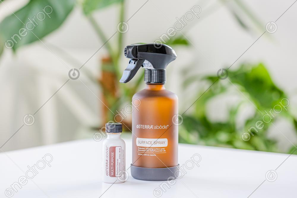 abōde multi-surface spray dispenser and cleaner concentrate with white background and plants. Blank space can be used to add text or high resolution image can be cropped creatively for Instagram, Facebook, or social media.