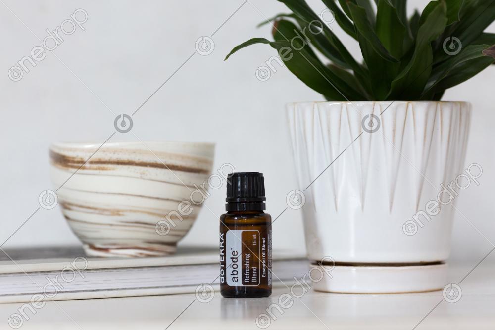 Product photo of Abōde Refreshing Blend 15 ml. Neutral color and minimalistic styling. Negative space for text overlay. Horizontal and vertical image included. The Abōde signature blend leaves your home smelling clean naturally. It's a blend of Lime, Litsea, Cassia, Lemon Eucalyptus, Tea Tree, Arborvitae, Kochii Eucalyptus, Cilantro, Lavandin, and Lemon Myrtle essential oils.