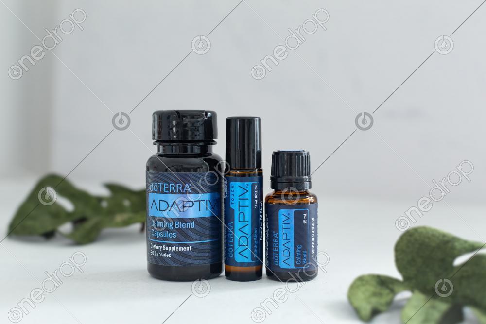 Adaptiv calming line. Bottle 15ml with essential blend, roller bottle 10ml and jar with capsules. Set on white background decorated monstera leaves.