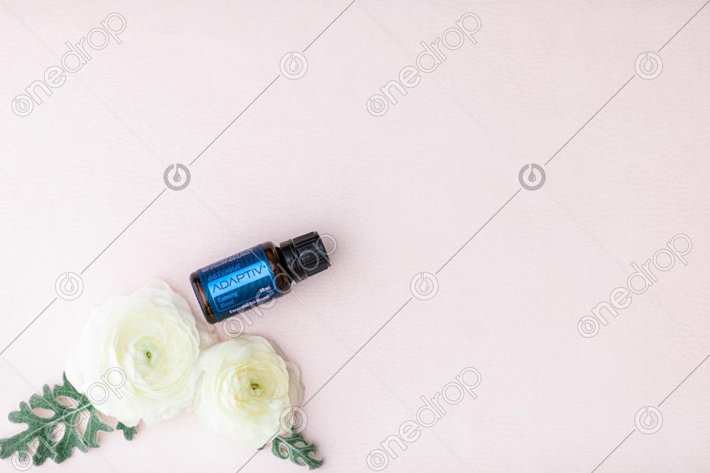 Adaptiv™ Oil Touch on pink background with white flowers and leaves. Blank space can be used to add text or high resolution image can be cropped creatively for Instagram, Facebook, or social media.