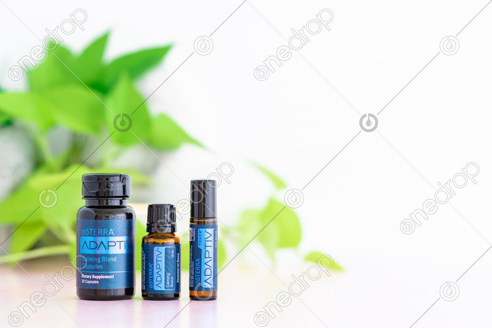 Adaptiv™ System on white background with diffuser and plant leaves. Blank space can be used to add text or high resolution image can be cropped creatively for Instagram, Facebook, or social media.