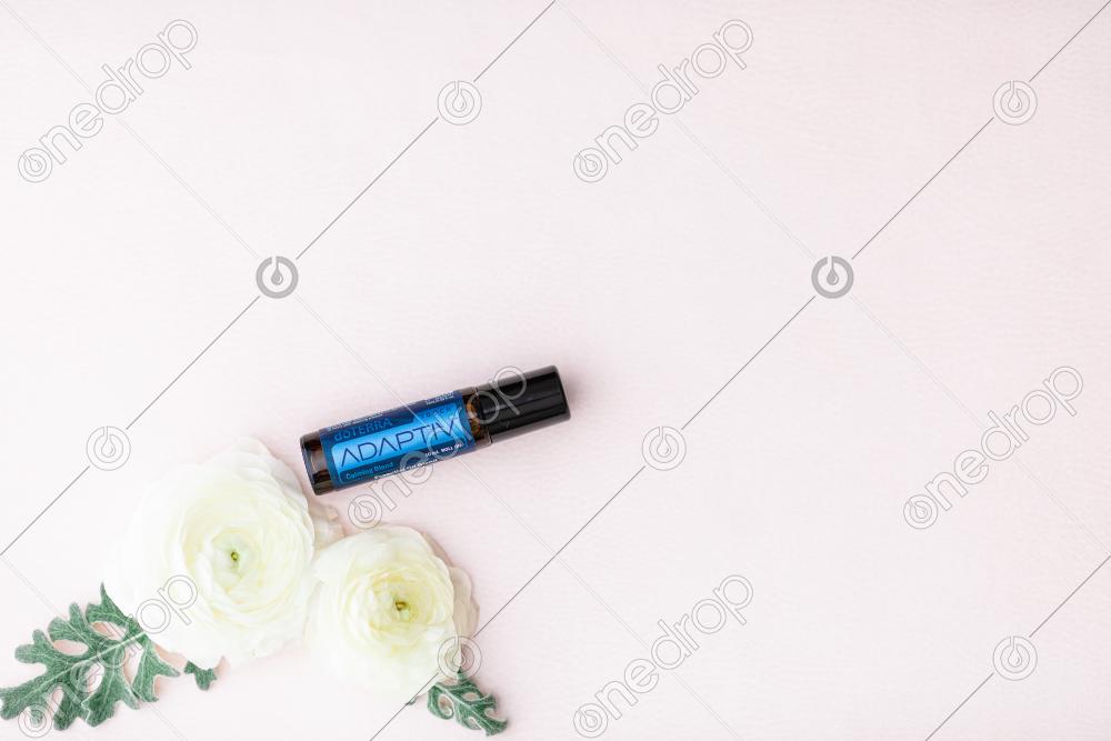 Adaptiv™ Touch 10 ml on pink background with white flowers and leaves. Blank space can be used to add text or high resolution image can be cropped creatively for Instagram, Facebook, or social media.