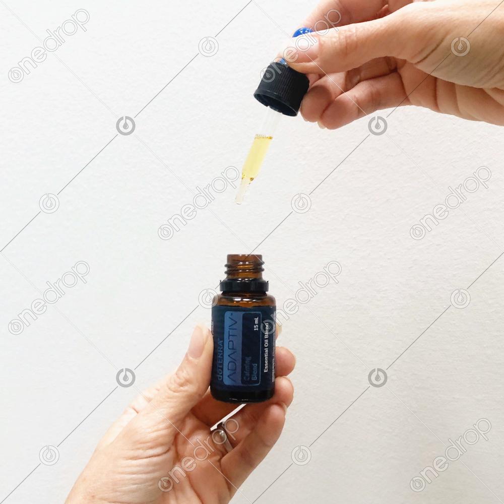 Image of hand holding dropper top and Adaptiv oil. White background.