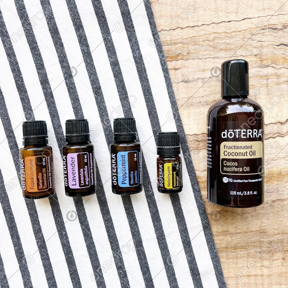 Features Frankincense, Lavender, Peppermint & Helichrysum in a Flat Lay.