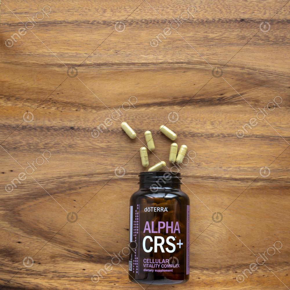 Closeup product photography of Alpha CRS+ supplement laying down on a wood table top.