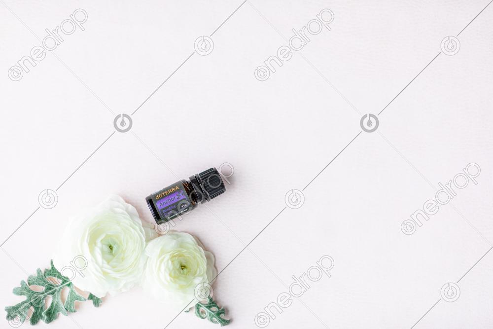 Anchor 5 ml on pink background with white flowers and leaves. Blank space can be used to add text or high resolution image can be cropped creatively for Instagram, Facebook, or social media.