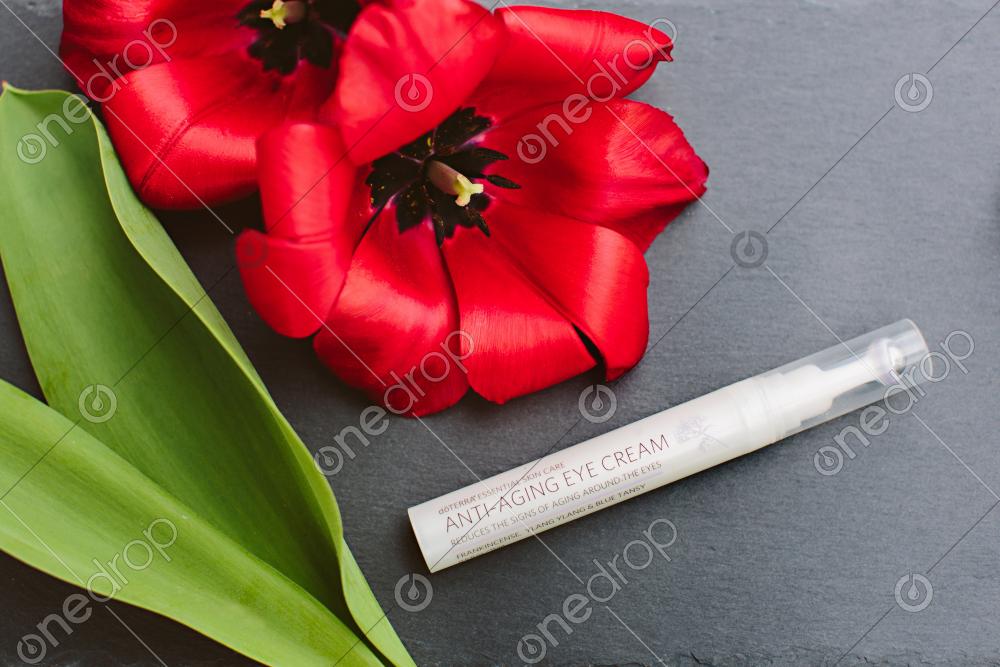 High-resolution photograph of the Anti-Aging Eye Cream with simplistic botanicals on black slate. Horizontal orientation with room for text if desired.