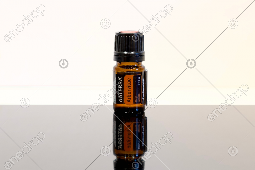 High-resolution photo with Arborvitae 5mL oil bottle on a mirrored surface.