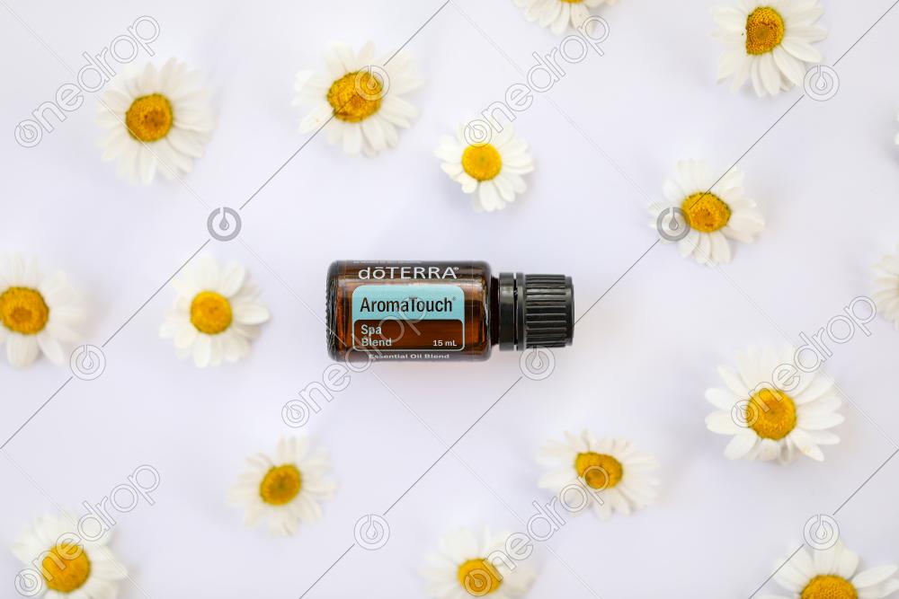Aromatouch flat lay with white background surrounded by chrysanthemum flowers