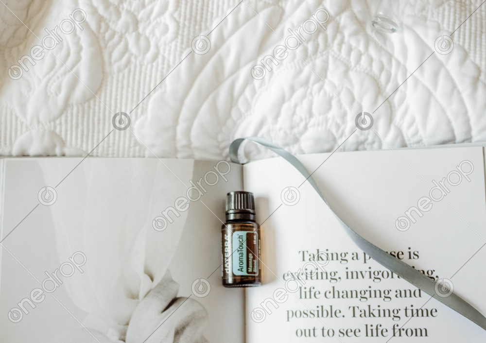 Bright image of AromaTouch laying in a book with a white quilt behind.