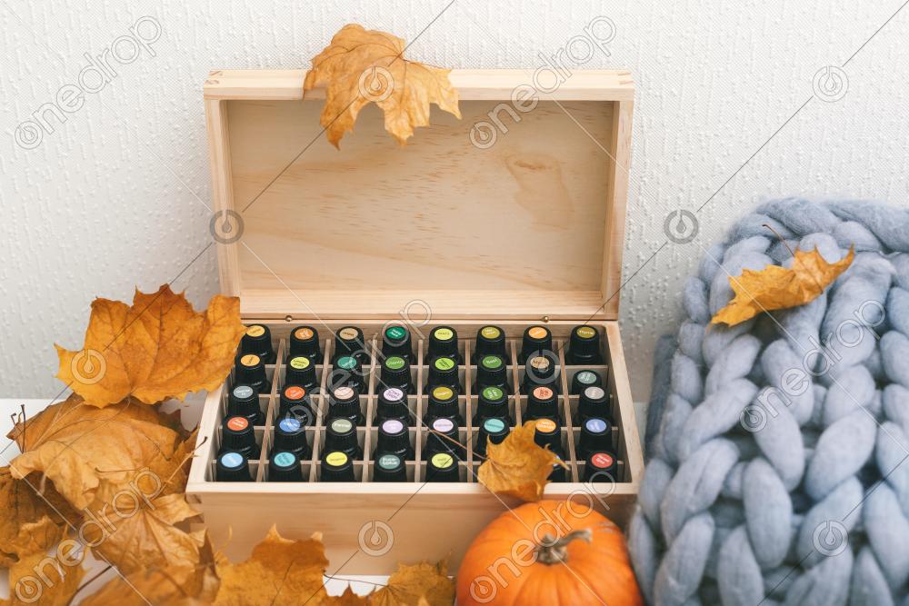 Autumn scene with bottles, storage wooden box, maple leaves and warm merino knitted plaid
