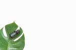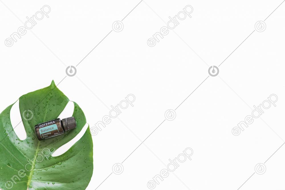 Balance® essential oil on white background with monstera plant leaf. Blank space can be used to add text or high resolution image can be cropped creatively for Instagram or social media.