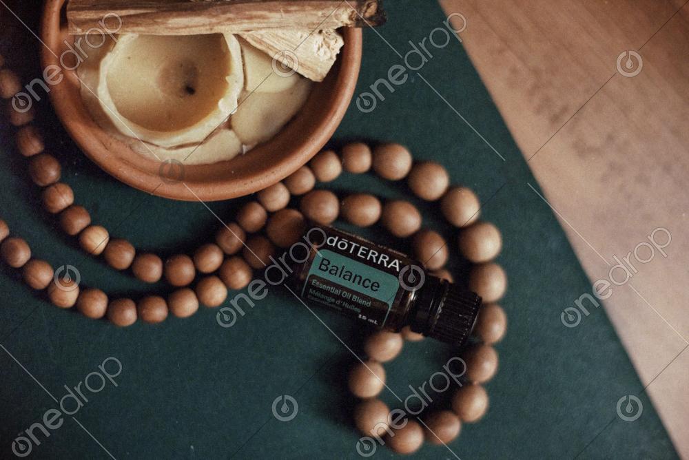 This product photo features a 15ml bottle of Balance, on a dark deep green yoga mat, surrounded by wooden beads, beeswax candles and palo santo.