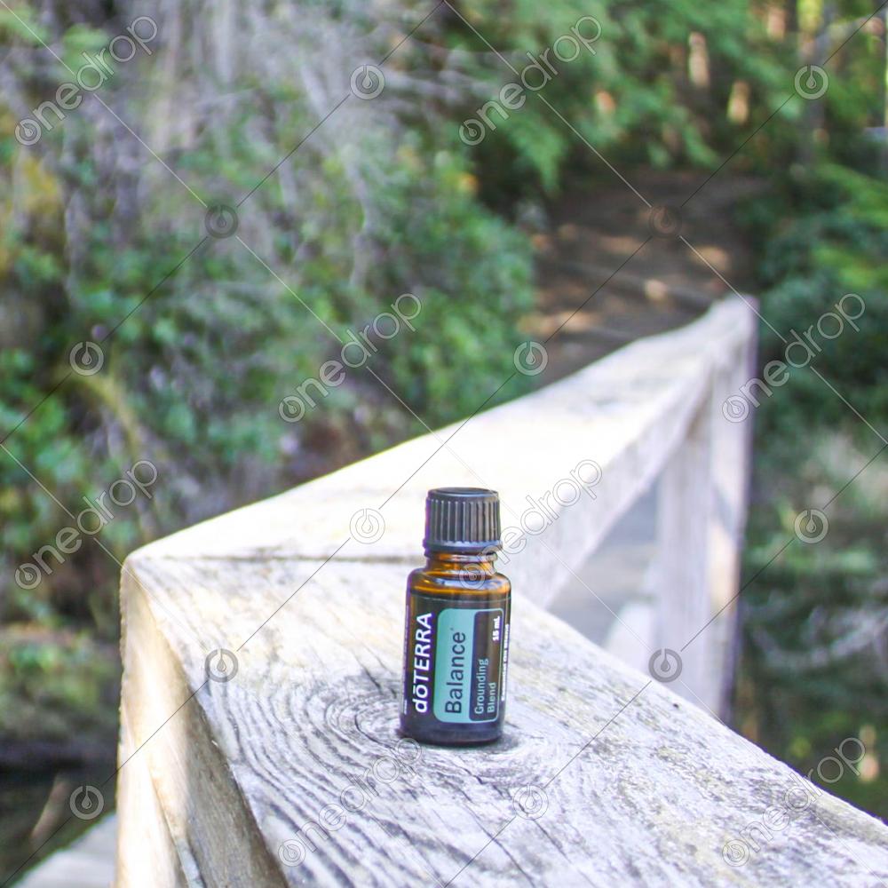English: a bottle of Balance blend, on the top of a wooden handrail of a bridge. Green forest. Garden.