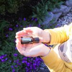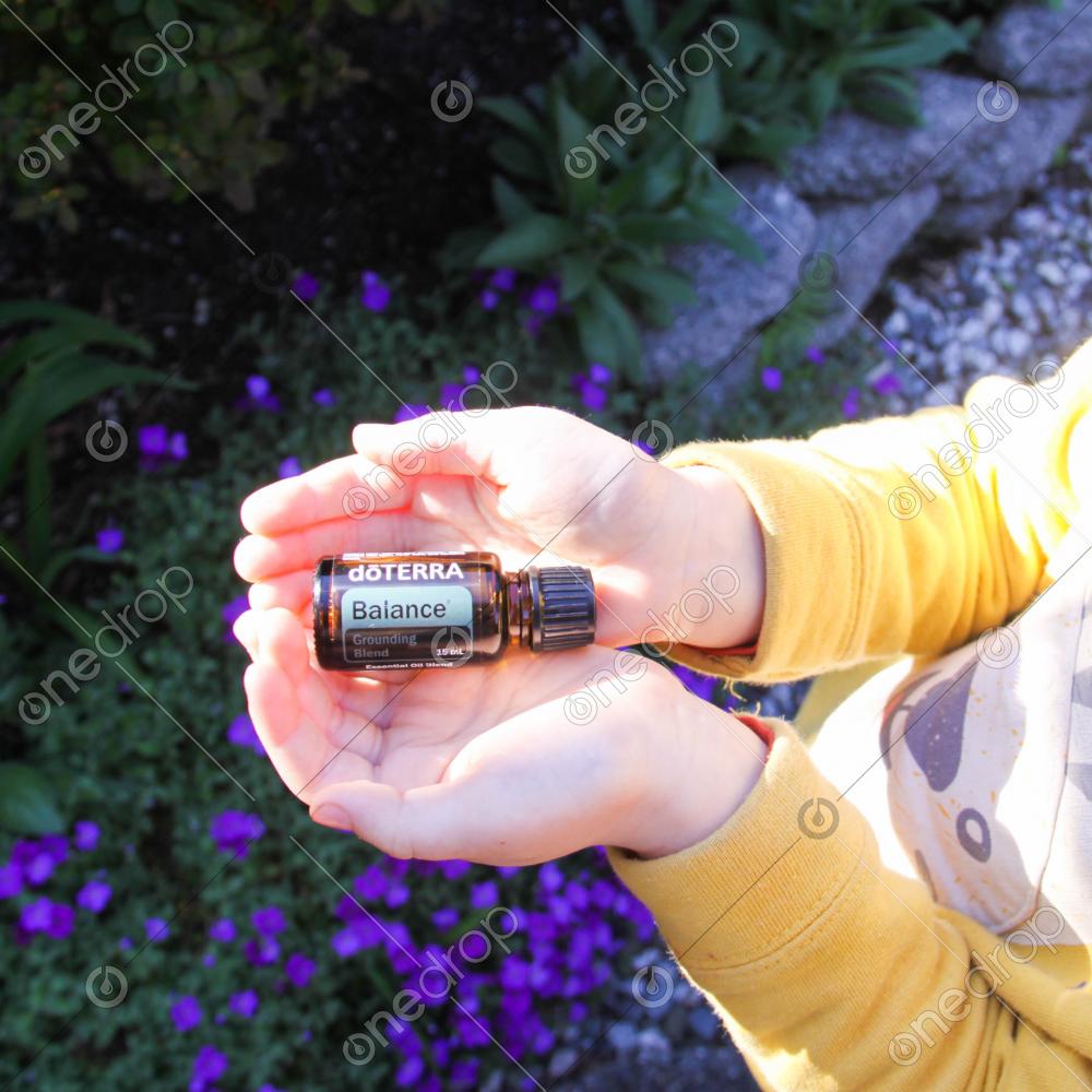 English: Kid holding Balance blend with his hands. Purple/blue flowers in the background. Light. Sun.