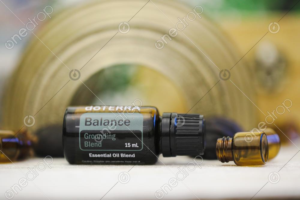 dōTERRA Balance on display with sample drams and gold rainbow background