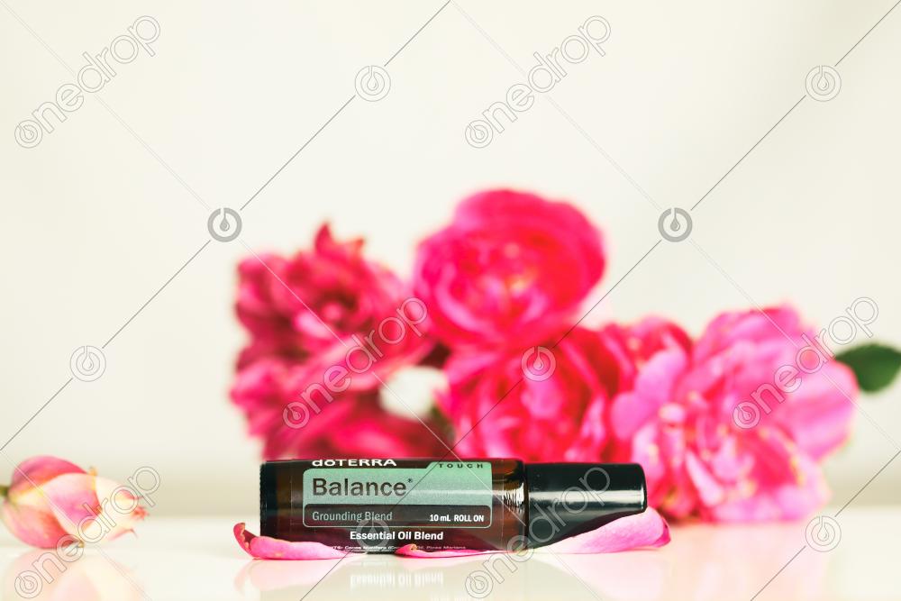 dōTERRA Balance Roll On with fresh pink flowers on white background