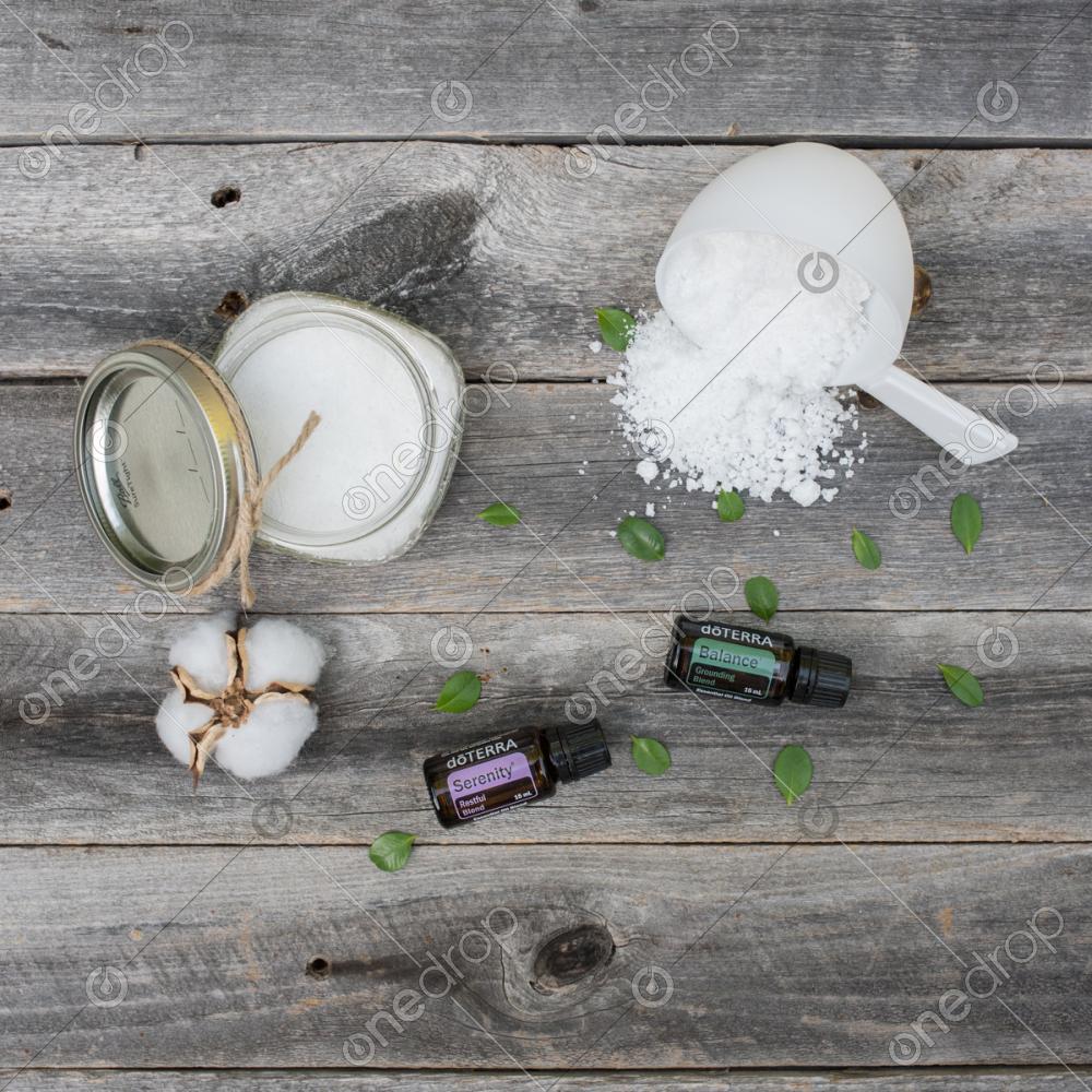 Bath Salts Layflat with dōTERRA Serenity and dōTERRA Balance Oil Blends on rustic wood