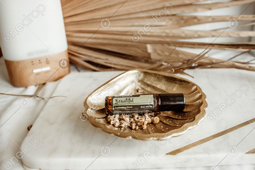 High Res image of Beautiful Touch laying in gold shell on a marble board with Lumo diffuser, dried palm leaf in background.
