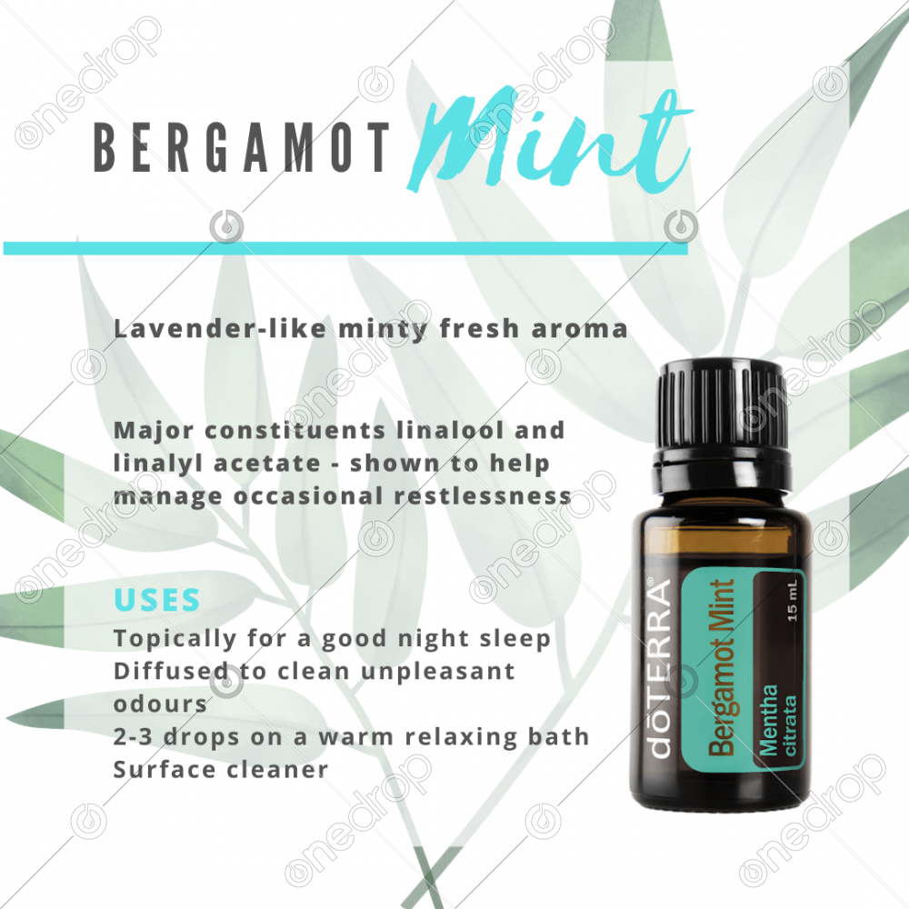 Description and uses of Bergamot Mint Oil. Black and turquoise colours with two leafs in the background