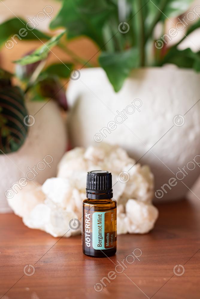 Bergamot Mint with crystal and plants in background. Can be cropped and used for social media, emails, and with room for text.