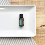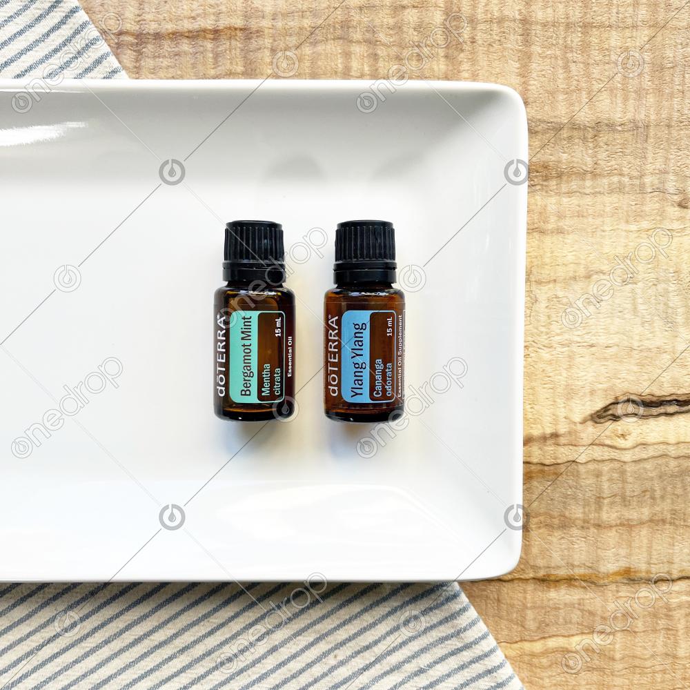 Features Bergamot Mint & Ylang Ylang in a Flat Lay. Also features each oil individually on a Striped/Wood/White Plate Background.