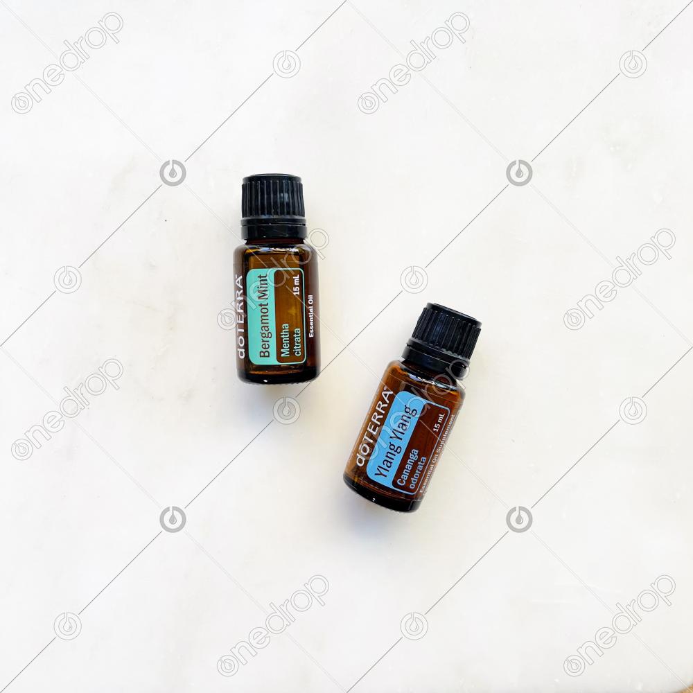 Features Bergamot Mint & Ylang Ylang in a Flat Lay. Also features each oil individually on a Quartz Background.