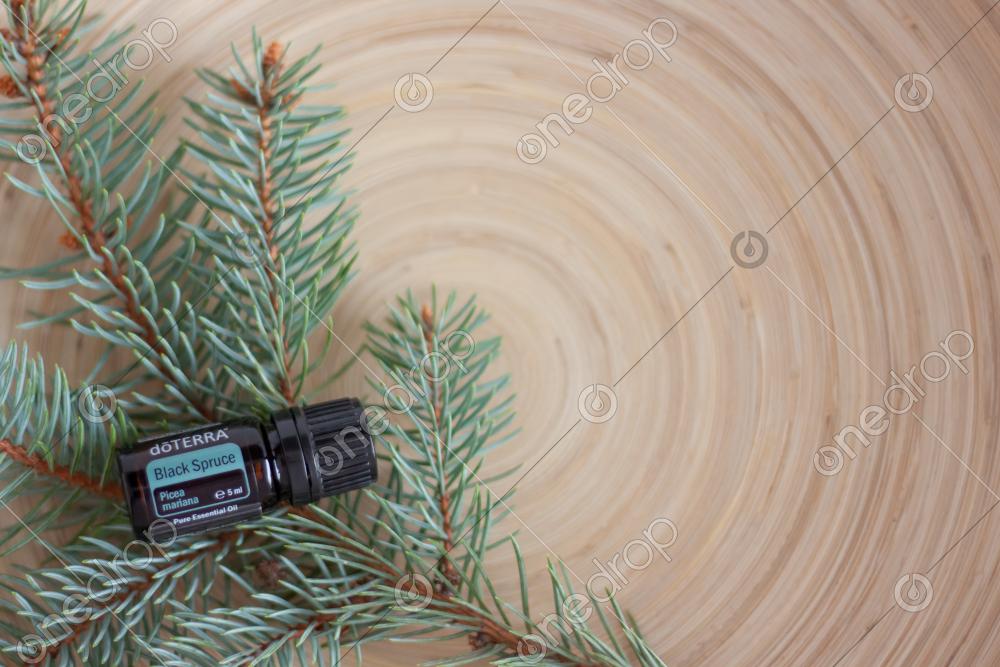 Black Spruce on a branch and a wooden plate