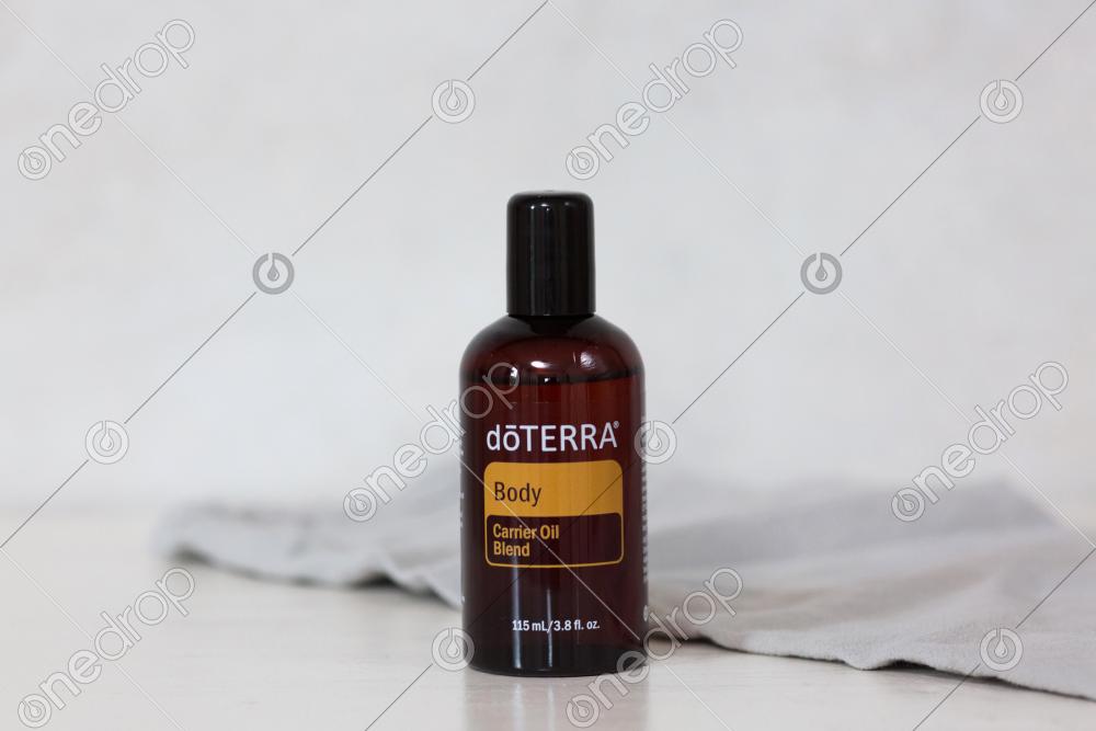 Product photo of dōTERRA's Body Carrier Oil Blend with beige and neutral colors and minimalistic styling.