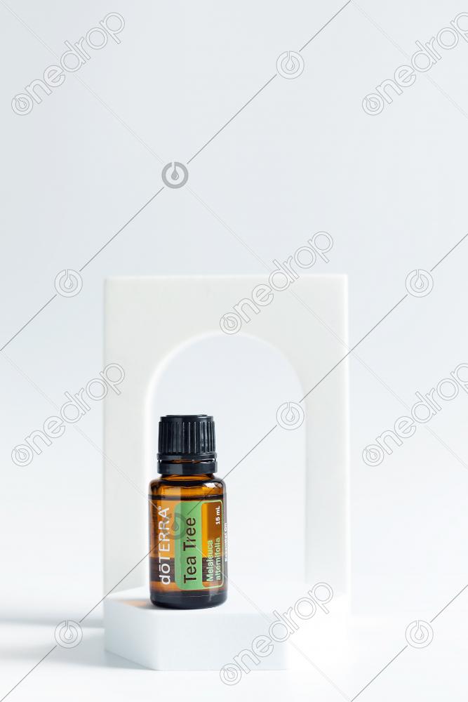 Bottle 15 ml with essential oil dōTERRA Tea Tree on geometric podium