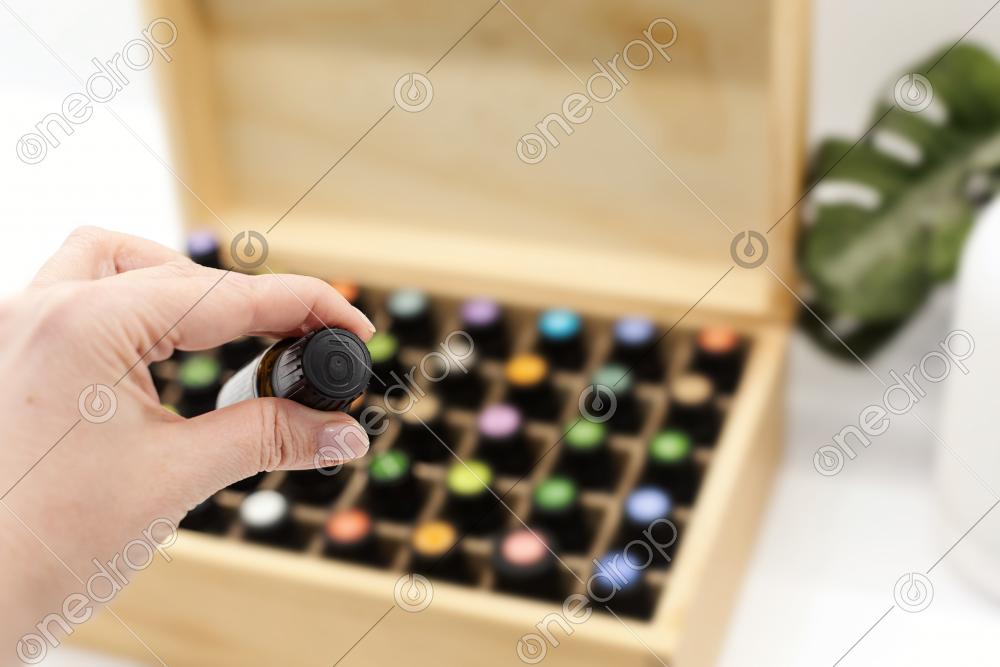 One essential oil bottle held in hand in close view, featuring an updated cap against a wooden box with an oil collection, highlighting the concept of precise drops and essential oil saving, additional protection against counterfeits and falsification, featuring an updated cap with a branded logo that ensures authenticity and product integrity